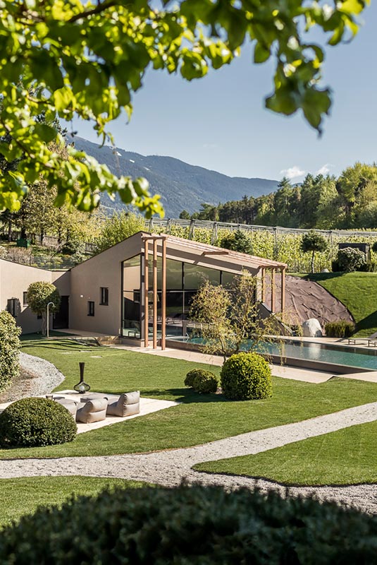Baden im alpinen Paradiesgarten Perfekt eingebettet in die Natur liegt der neue Pool- und Wellnessbereich des HOTELS SEEHOF in Brixen – ein Werk des angesagten Architekturstudios Noa*.