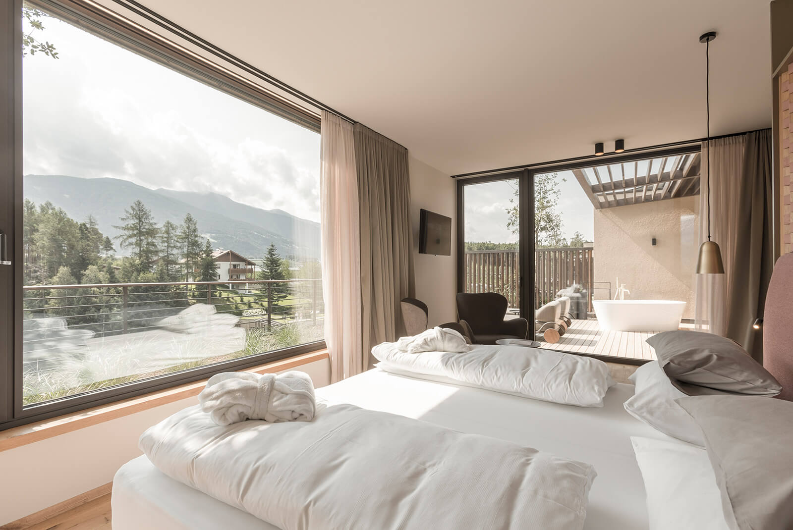 - begrünte Balkonterrasse (45 m²) mit freistehender Badewanne und Blick zum See und Morgensonne