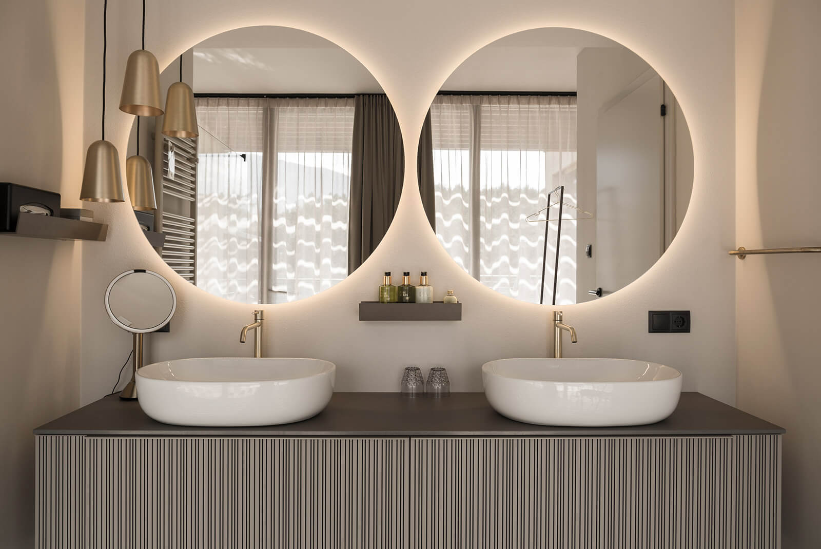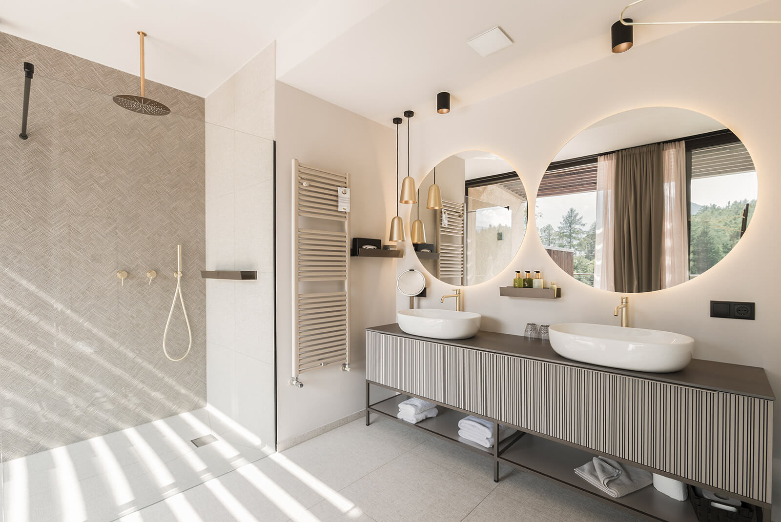 - offenes Badezimmer mit abgetrennten WC und Bidet, 2 Waschbecken und Regendusche